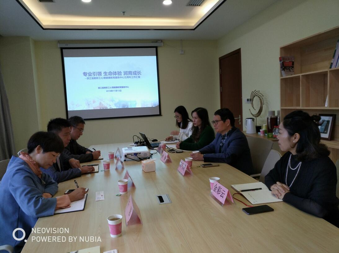 考察组受到省中心副主任、浙江工业大学工会主席何桥的热情接待。省中心相关老师介绍了中心“不忘初心、服务教工、持续发展、逐梦前行”工作理念;以“精品化、品牌化、专业化”心育培训及活动为载体,拓展教职工心理健康教育的新途径,促进教师的自我体验、自我启发、自我成长的工作举措等。同时就送心理健康服务下基层活动工作作了具体交流和经验分享。