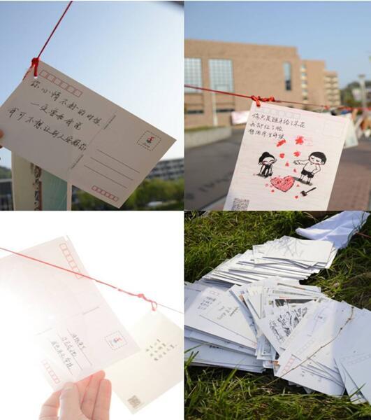 很多时候伴随着生活节奏的加快,我们的情感轨迹也变的疏忽,许多感情始终埋藏在心底,无从表达。此次活动主要流程为设点分发,同学自主创作及最后的回收展示。同学们用简练精致的三行语言表达了对情侣的告白,朋友的祝福,家人的牵挂及往事的追忆,也用各式的字画表达自己对于爱情的独到见解,每一句都带给我们真切的感动。