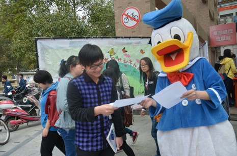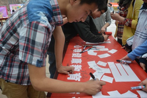 在活动现场,多张绚丽、个性的宣传海报十分醒目,真人装扮的唐老鸭和米老鼠也来到现场助兴、活跃气氛,师生们踊跃地在活动月的宣传语条幅上签名。与此同时,活动承办方的志愿者们热情地向大家介绍本届心理健康教育活动月即将举办的一系列子活动,并耐心地解答疑问。2个小时后,在数条大红色的宣传语条幅上就密密麻麻地挤满了师生们各具特色的签名,活动承办方把签名条幅在生活区的醒目位置悬挂起来。
