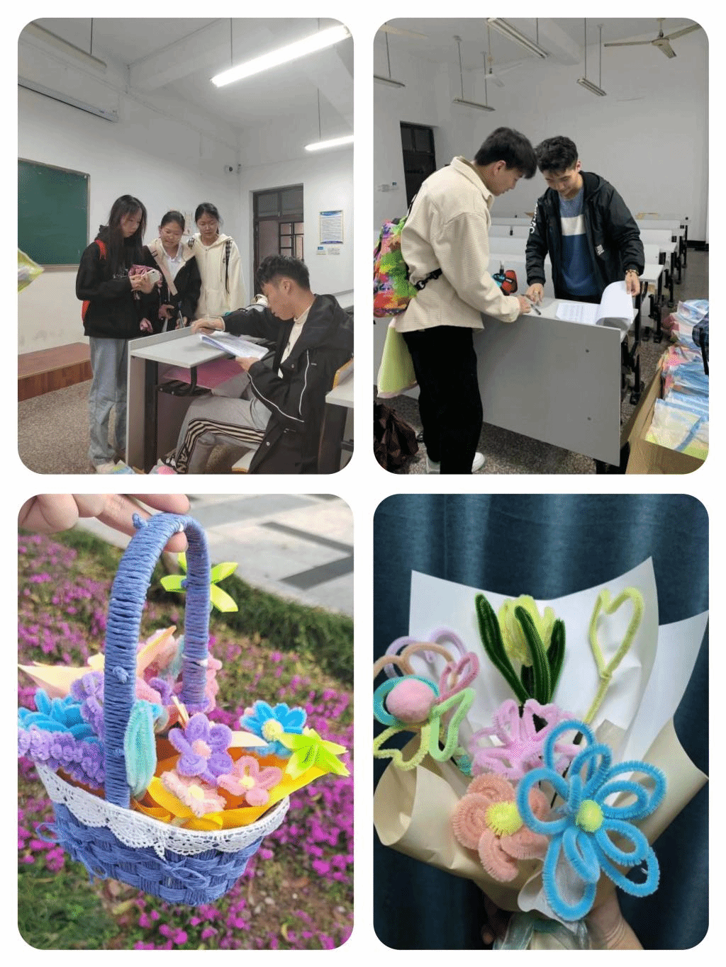 活动伊始,同学们踊跃报名,得到全校各二级学院广大同学的积极响应,组建160余支队伍,累计480余人次参加。经过如火如荼的制作,普通的扭扭棒摇身一变成为各式各样精美的花束,大家自由发挥想象力,或用画纸包裹,或用花篮装饰。紧接着展开了热火朝天的投票环节,最终有三组选手脱颖而出,分别夺得冠亚季军。