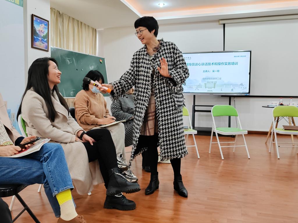 吴一玲副部长结合高校师生谈心谈话实操,从言语沟通与非言语沟通、心理谈话目标与适用范围、心理助人谈话要点与演练、心理危机谈心谈话演练等方面细致展开讲解,强调了谈心谈话时要关注到学生的身体情况(眼神、面部表情、动作等),也要关注学生的心理情况(认知、情绪情感、意志等),同时用生动的案例展示了心理助人谈话与教育管理谈话的差别。为增强培训效果,吴一玲副部长现场请老师们进行分小组讨论和实操演练,通过实践训练,老师们对谈心谈话技术有了更为直观深入的理解和运用。