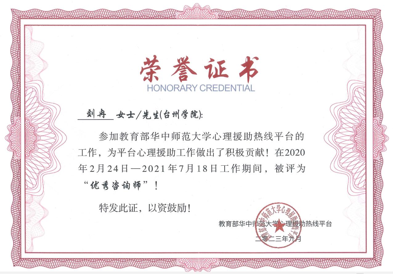 近日,教育部华中师范大学心理援助热线平台公布了第1阶段至第9阶段的优秀咨询师、优秀志愿工作者和优秀集体。我校金彩云、刘冉等老师组成的心理咨询师团队被评为“优秀集体”,刘冉老师被评为“第1-3阶段优秀心理咨询师”。