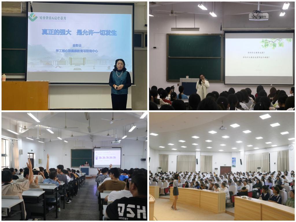 金彩云作《允许一切发生》主题讲座,从海灵格的《我允许》导入主题,与同学们分享感悟,允许精彩校园里可能会发生的一切,这样也会遇见另一种演绎青春的可能性。王蕴瑾作《拥抱不确定,开启“心”大学》主题讲座,在介绍了心理健康的基本知识后,细数大学与中学的区别,提倡同学们建立积极的思维,调动内在动力和外界支持,学会求助,提升心理韧性。史莉娜作《向阳心知,在大学遇见更好的你》主题讲座,细数大学之“大”,帮助同学们了解心理健康在自我发展中的关键作用,鼓励同学们以健康积极的心态迎接大学的挑战。