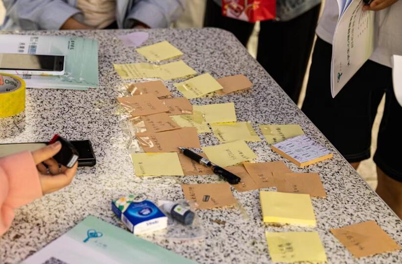在工作人员的维护与参与同学的配合下,活动井然有序地进行。同学们依次在便利贴上写下自己的烦恼,粘贴在桌面上,并挑选上面别人的烦恼来写下自己的建议。通过述说内心积压的烦恼,以及帮助他人排解心中的困扰,让烦恼能够得到宣泄和分享,并以一颗助人之心关爱自己、温暖彼此。