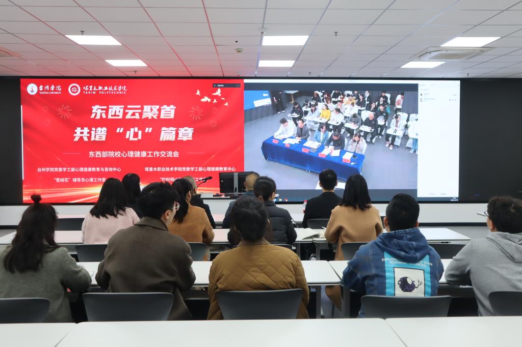 12月10日,台州学院与塔里木职业技术学院跨越千里,在“云”端联合举办以“东西云聚首·共谱心篇章”为主题的东西部院校心理健康工作交流会。我校学工部部长杨启富、塔里木职业技术学院党委委员、副院长梅娇出席并讲话,塔里木职业技术学院学工部部长胡建宇主持会议。两校二级心理辅导站负责人,学工部心理中心专职咨询师、部分辅导员参加交流。