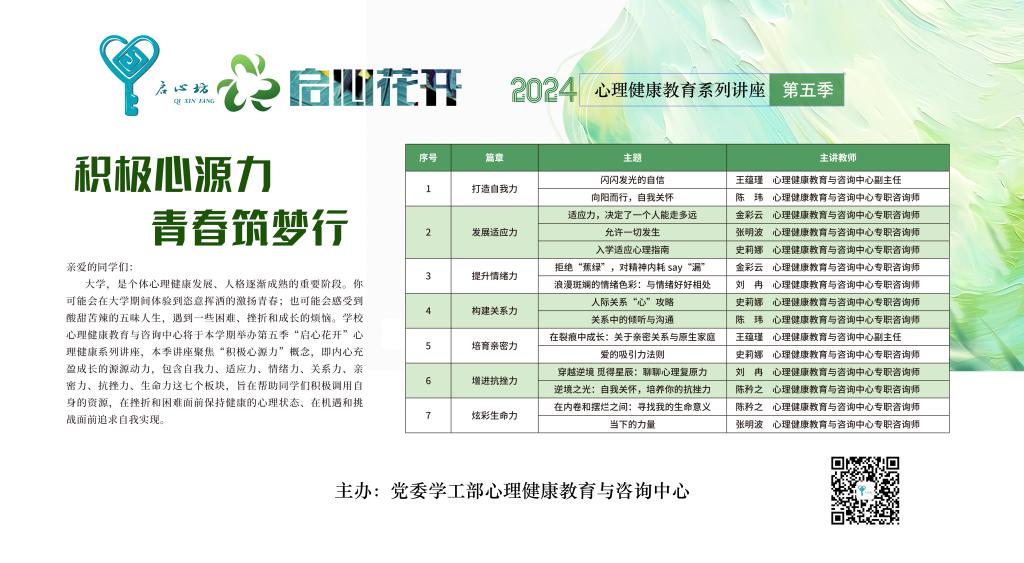 为进一步贯彻落实教育部等十七部门印发的《全面加强和改进新时代学生心理健康工作专项行动计划(2023—2025年)》要求,提升我校学生心理健康水平,推进心理育人工作走深走实,学工部心理健康教育与咨询中心于本学期多层次举办第五季“启心花开”心理健康系列讲座,多角度宣传和推广心理健康知识。