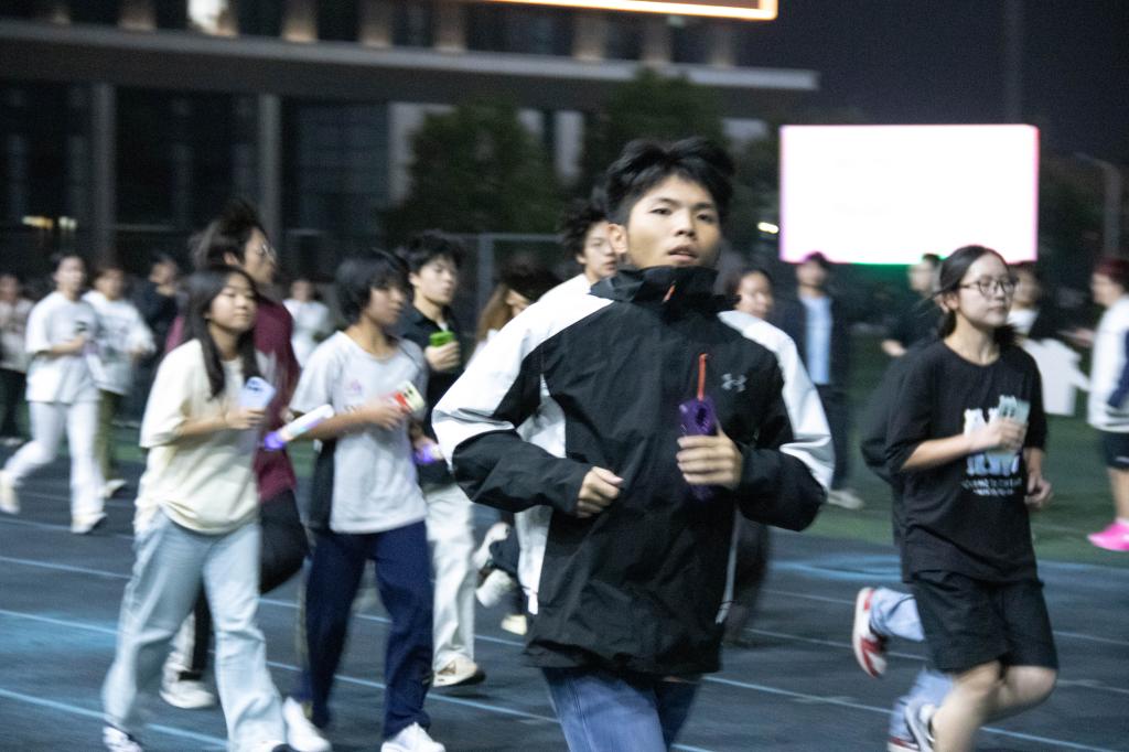 工作人员精心筹备了星星手环、荧光棒、精美书签等礼品,同学们满怀期待地将这些荧光装备穿戴在身,荧光与夜色相互辉映。随后,同学们迈着轻快步伐奔跑起来,身姿矫健,好似一颗颗划破夜空的流星,在操场上肆意穿梭。他们汇聚在一起,形成了一条明亮而灵动的光带,为原本宁静的操场增添了无限活力与迷人光彩。跑步结束后,同学们来到“荧光心语·夜绘心晴”荧光绘画活动区域,用荧光颜料代替语言,让夜跑之后的畅快得以表达,完成了一场与自己的“身心对话”。