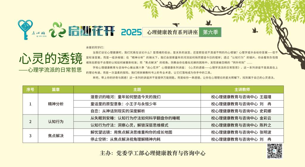 第六季“启心花开”以“心灵的透镜——心理学流派的日常哲思”为主题,聚焦精神分析疗法、认知行为疗法和焦点解决疗法三大心理学流派,通过生动实例与科学理论相结合,将深奥、专业的心理学理论转化为触手可及的生活智慧,既深化了学生对心理运作机制的理解,更培养了学生在应对挑战时的实操工具库。日前,本季7场讲座圆满完成,累计吸引逾千名学生参与,评价广泛良好。