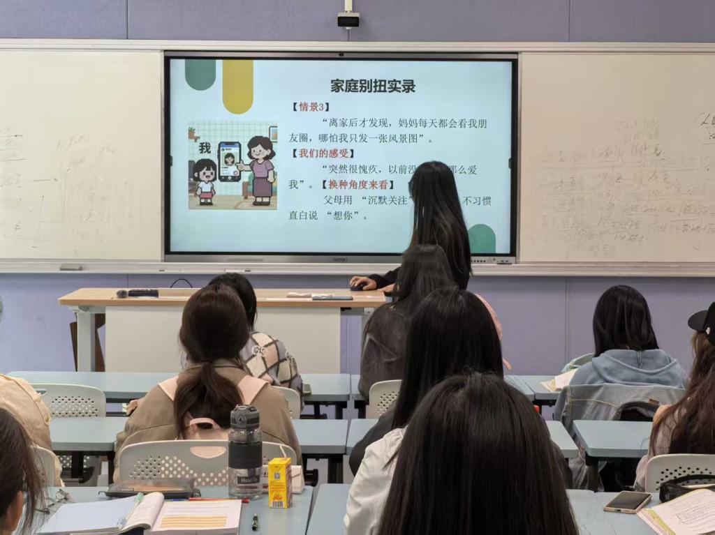 班会中,每个教室成了“关系实验室”:有的同学主动分享了父母悄悄来校探望自己的故事,朴素的细节唤起了大家对亲情默默付出的珍视;有的班级则围坐成圈,组织室友互赠亲手写的卡片,真挚的话语拉进彼此距离;有的则用情景短剧还原“室友因作息争吵又和解”的过程,学习“非暴力沟通”的表达艺术;还有的同学在班会结束后,当即约定给家人打个电话说说近况,并和室友开一场卧谈会,把藏在心里的小情绪摊开聊聊……心理委员们则纷纷化身“温暖引路人”,把一场场心理班会,变成了“我们的故事会”。也有不少班主任参与其中,教师教育学院新生班班主任金旭球老师分享了发生在师生与家长之间的小故事,串联起亲情、友情与师者的关爱。