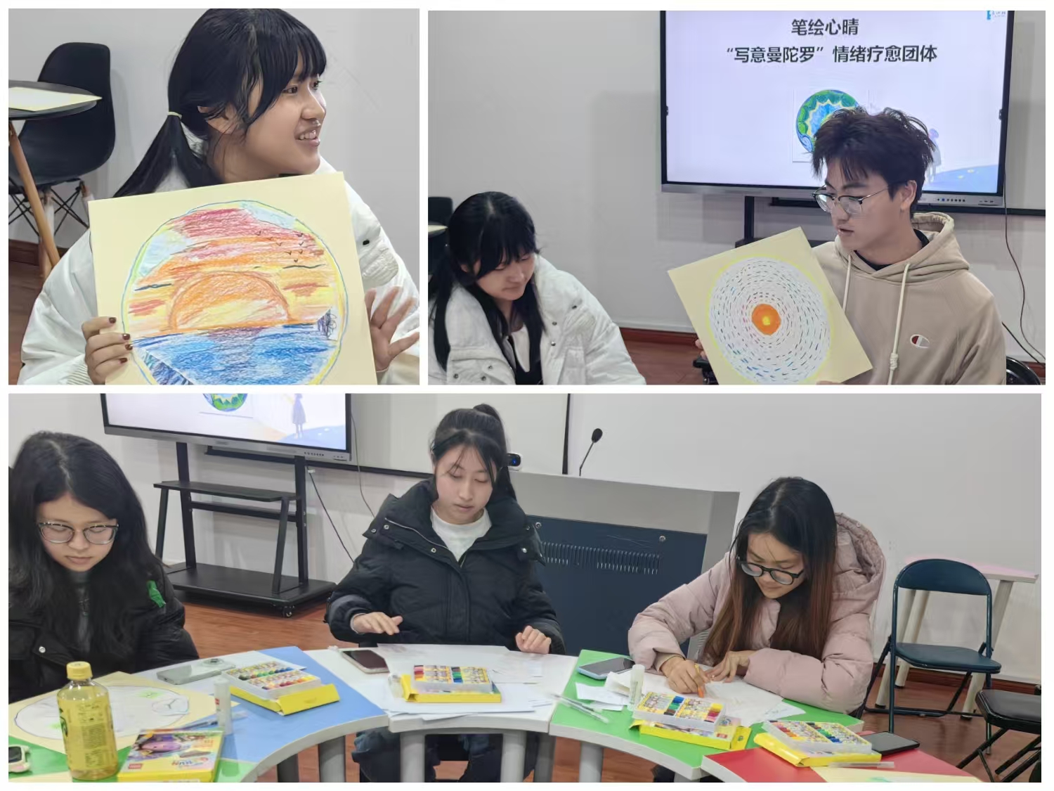 此次“笔绘心‘晴’”团体辅导,以曼陀罗创作为情感载体,将抽象情绪转化为具象艺术表达,既为同学们提供了安全的情绪释放出口,也助力大家在互动中学会理解与接纳自我。活动让同学们掌握了“涂鸦宣泄—撕碎释放—拼贴整合”的简易情绪调节方法,更通过朋辈间的情感共鸣强化了心理支持网络。据悉,校心理健康教育与咨询中心将持续丰富“启心有约”系列活动形式,为学生心理健康成长注入持久动力。