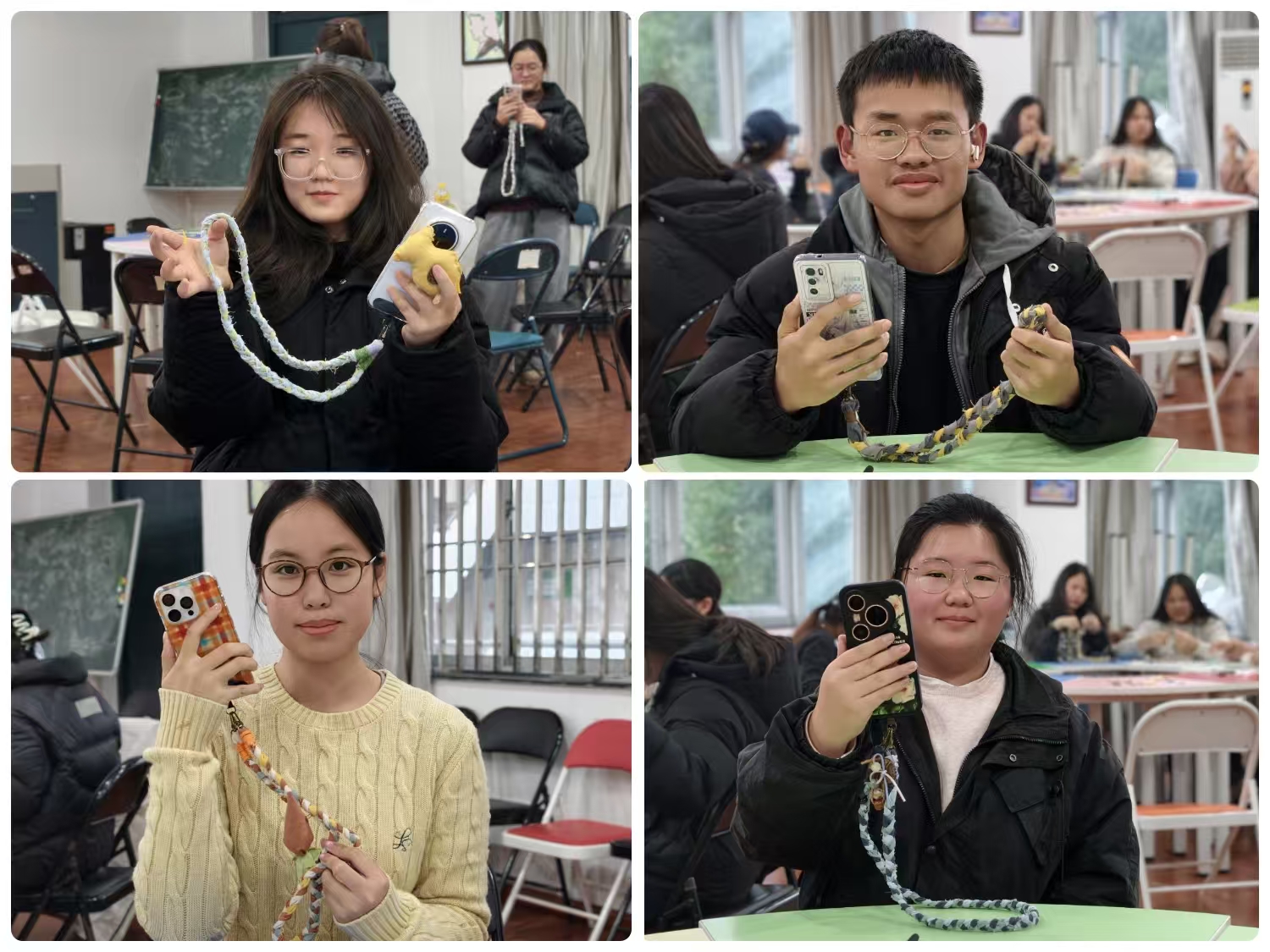 作品完成后,同学们纷纷展示成果、分享感悟。“编织时全神贯注,不知不觉就放松了”“和同学探讨设计、学习新技巧,还收获了专属作品,很有成就感”,真挚的分享引发共鸣,进一步增进了朋辈联结。