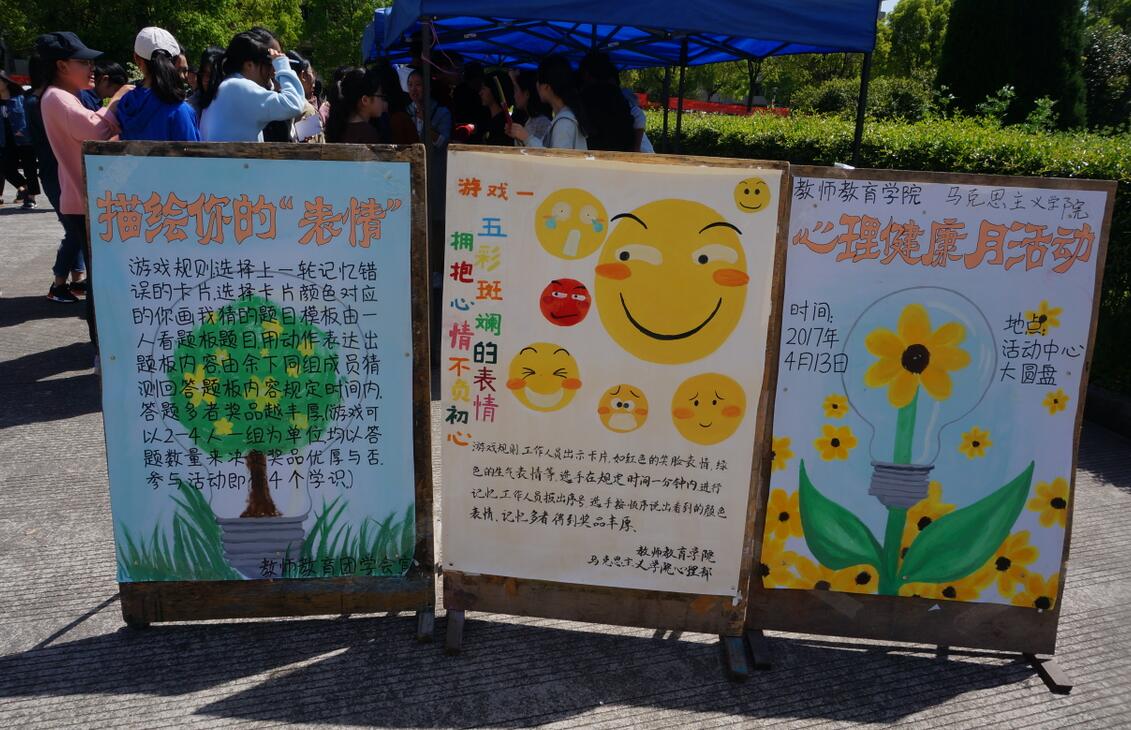 为进一步提高大学生心理素质水平,增强大学生自我调试能力。教师教育学院与马克思主义学院协同于4月13日下午在学生活动中心大圆盘处举办心理健康月活动。