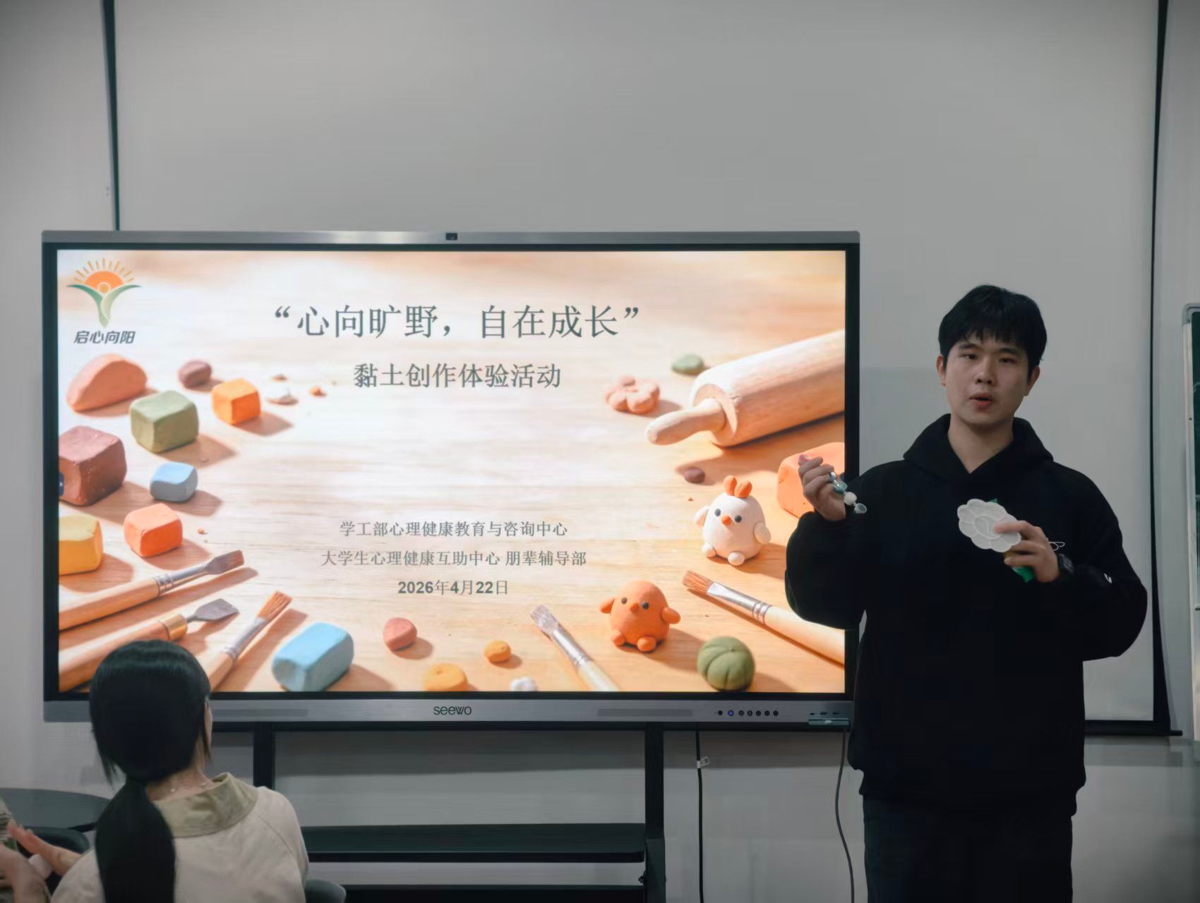 2026年4月22日,校学工部心理健康教育与咨询中心成功举办第34期“启心向阳”粘土创作心理体验活动,本次活动以“心向旷野,自在生长”为主题,由人文学院李轶群同学主持带领,吸引全校50余名同学踊跃参与,让同学们在指尖的粘土创作中,开启一场温暖治愈的自我探索之旅。