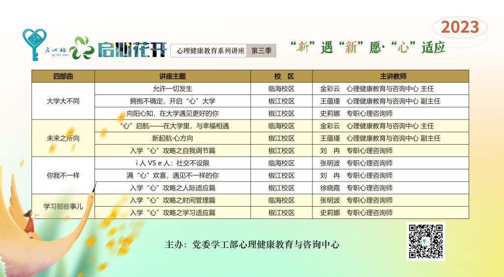 近年来,在大学新生中因心理适应问题而导致的学习、生活障碍案例日益增多。学工部积极谋划,将新生心理健康教育作为新生始业教育的重要一环,第三季“启心花开”以“新遇新愿·心适应”为主题,设计“大学大不同”、“未来之所向”、“你我不一样”、“学习那些事儿”4个板块,涉及开学季集体生活适应、人际关系调节、时间管理、自我调节、学业规划等共性心理主题,由校专职心理咨询师团队担任主讲,凝聚打造新生心理适应“四部曲”作为新生心理健康教育的“第一课”。日前,11个专题、22场讲座圆满落幕,全体大一新生积极参与学习,获得师生广泛好评。