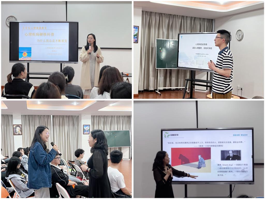 专职心理咨询师张明波作题为“心理求助全攻略:遇到心理困扰,该如何求助?”的讲座,以抑郁症为例,告诉同学们在遇到心理困扰时,如何进行自我调适、激活社会支持系统,以及向心理咨询师或精神科医生寻求帮助。