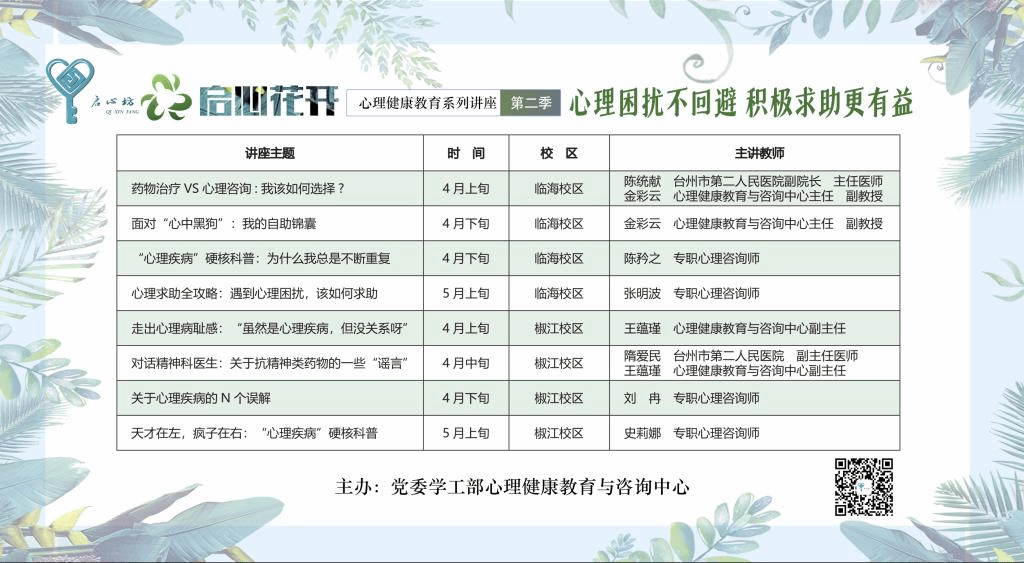 “启心花开”立足心理科普,通过专题讲座、科普宣讲等方式,面向全体师生普及心理健康知识、传播积极的健康理念。本季“启心花开”围绕抑郁症、强迫症、双相情感障碍等心理疾病做硬核式科普,引导同学们关注自我情绪状态以及身边同学的心理危机信号,积极应对各种心理困扰,拓宽求助渠道,提高主动求助、互助、自助意识。