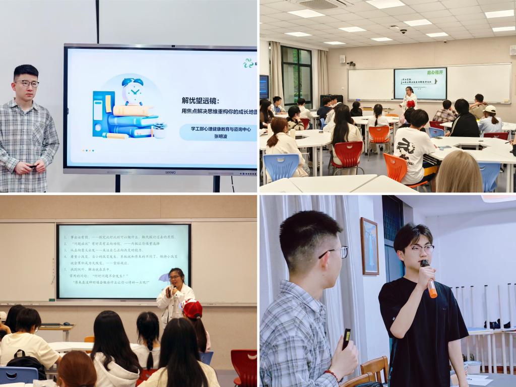 焦点解决技术板块则打破传统问题分析范式,以建构思维挖掘学生内在资源,显著提升了心理赋能的时效性。专职心理咨询师张明波的“解忧望远镜:用焦点解决思维重构你的成长地图”讲座,提出“问题是暂时的迷雾,目标是永恒的灯塔”这一核心主张,通过拆解“成果问句”“刻度化评估”等实用技术,引导同学们跳脱问题困境,聚焦自身优势与可实现目标;专职心理咨询师刘冉围绕“停止空转:从焦点解决视角理解精神内耗”主题,以焦点解决短期治疗(SFBT)为核心,聚焦“如何减少精神内耗,促进有效行动”,通过“目标导向、资源取向、小步改变”的核心理念以及丰富的实例讲解,帮助同学们从“问题思维”转向“解决思维”,在自我觉察中打破消极循环,提升心理效能。