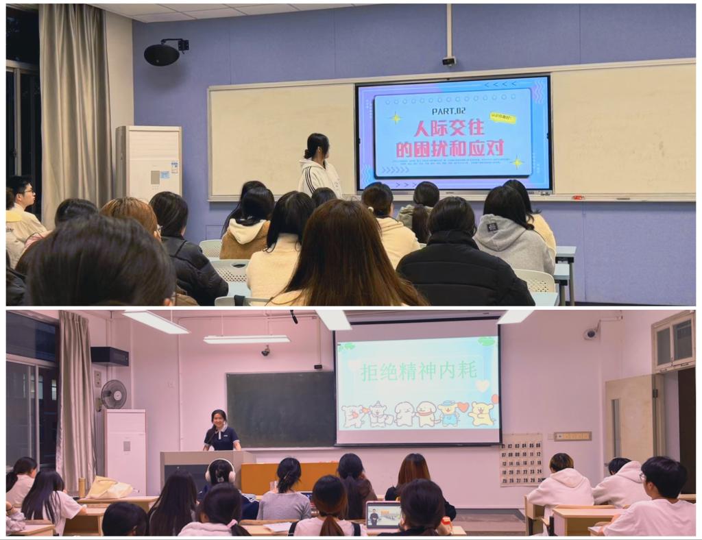 各班级紧扣大学生心理成长需求,设计主题鲜明、形式鲜活的班会内容,如外国语学院“拒绝精神内耗”主题班会中,同学们通过传递心情卡片接龙,将抽象情绪转化为互助能量;人文学院“大学生人际关系”专题以“分享我的心动爱好”为切入点,让志趣相投的同学结成成长伙伴;电信学院“情绪解码”活动中,用手绘Emoji表情包的创意形式,帮助同学们具象化表达内心世界;教育学院“撕掉标签”互动墙前,同学们揭下“社恐”“拖延症”等刻板标签,写下个性化成长宣言。