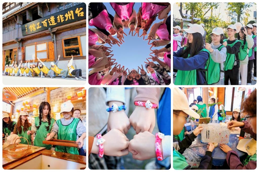 老街团队打卡环节布置了数个创意造型打卡点,各小组同心协力,按图索骥,用镜头记录合作瞬间,在古朴建筑群中培养团队默契。美食寻宝任务中,各小组凭借线索寻找特色美食,在香气四溢的环境里增进交流,体验任务完成的成就感。团队梦想蓝图环节,彩笔在白布上自由挥洒,同学们通过集体创作提升沟通协作能力,凝聚团队力量。非遗手工体验则让每位参与者动手制作独特的心愿手环和古法纸灯,彼此相赠美好祝福,践行“心聚微光,携手同行”的活动精神。