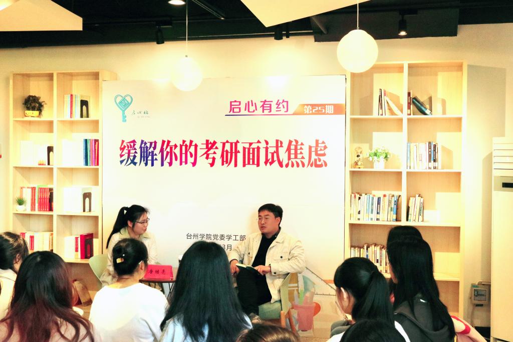 3月9日下午,由学工部心理健康教育与咨询中心组织的“启心有约”第25期活动在心湖书院举行。活动邀请教师教育学院心理学教师唐继亮博士以“缓解你的考研面试焦虑”为主题,与同学们进行面对面交流。活动由专职心理咨询师刘冉主持,25位学生代表参加。
