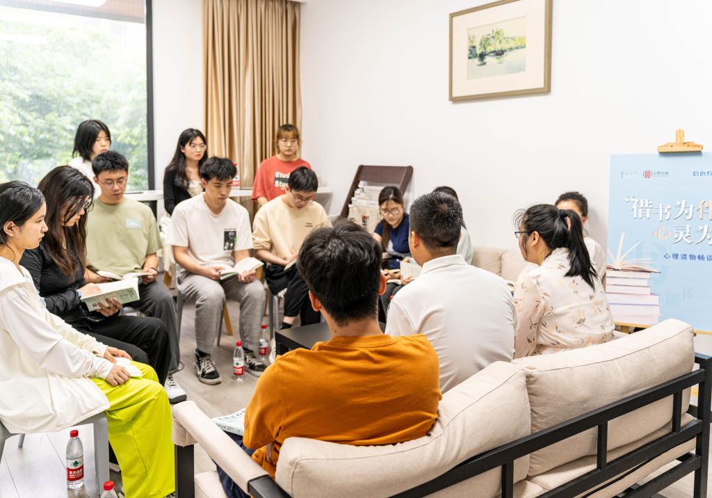 读书会上,刘冉简要讲解了书中涉及的“内在小孩”和“德马蒂尼”两种自我觉察方法,鼓励同学们积极地探索自己,温柔地对待自己,尝试在生活的细节之处体验自己与他人的精彩。高阳结合自身工作实际谈及“心流”感受,引导同学们在学习生活中发展自身性格优势,找寻缓解学习压力的应对方式。张本金鼓励同学们多思考、多与老师交流,增加对生活的理解。交流中,现场同学纷纷各抒己见,分享各自所思所想,共同探究积极的自我相处之道。