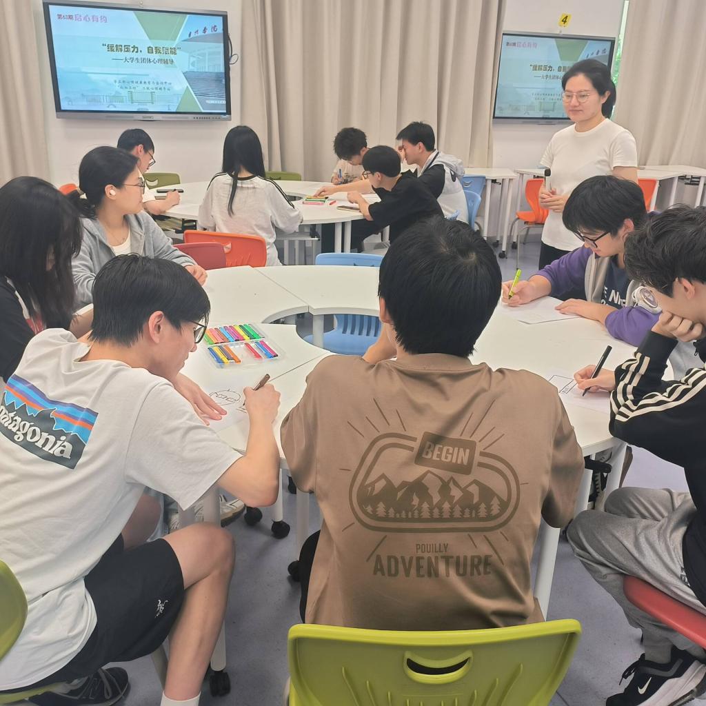 活动以轻松有趣的“抓手指”游戏作为暖场,同学们围成一个圈,在游戏中活跃现场氛围。“压力漂流瓶”环节中,伴随着轻松愉悦的音乐,同学们通过击鼓传花的方式传递压力漂流瓶,互相分享彼此之间压力事件,并提出了解决方案。在“压力变形计”环节,同学们通过自由联想的方式对压力进行绘画创作,并通过重塑压力进行再创作和分享。最后,同学们通过校园能量传递,相互给予祝福,传递了对伙伴们的祝愿和应对压力的信心。