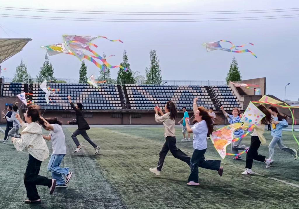 在教室里,同学们用画笔在空白的纸鸢上描绘自己的心理世界,通过涂色、点缀丰富整个纸鸢。同学们挥毫泼墨,各展绘画才华,纷纷在纸鸢上展现出独属于自己的风采。放筝阶段,同学们来到操场,借着徐徐微风,放飞他们自己的烦恼,剩下的只有对自己未来的憧憬。纸鸢在天空中翱翔起舞,仿佛白云与纸鸢共舞。