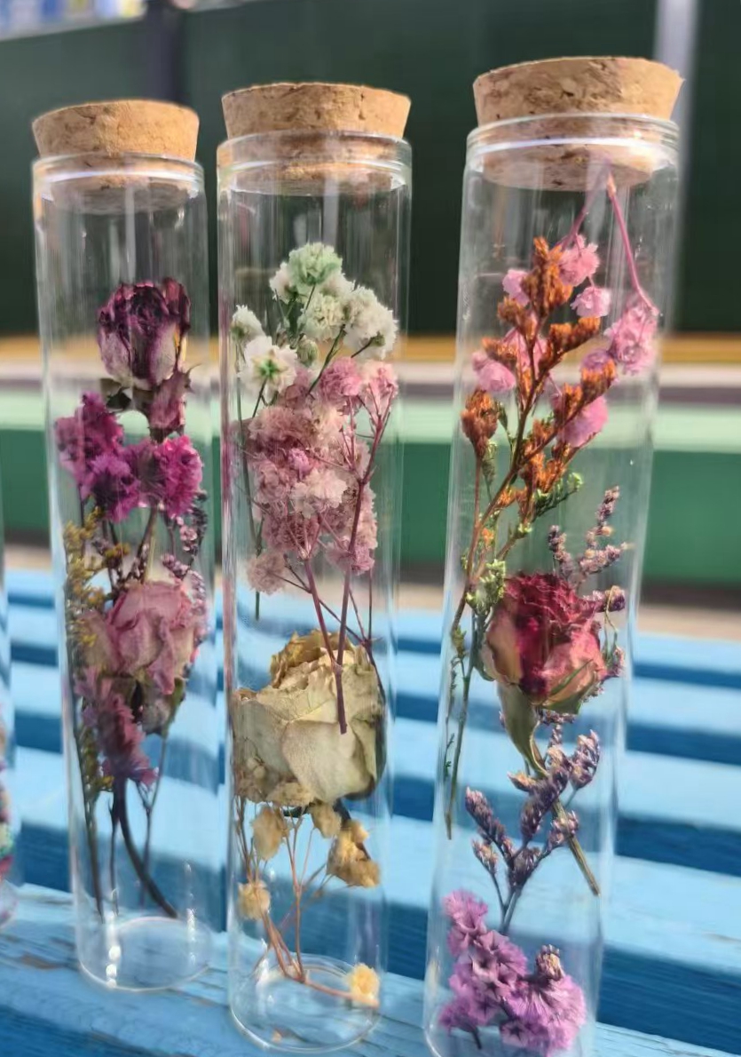 活动现场,精心布置的物料区令人眼前一亮。清新雅致的蓝色满天星、散发着独特香气的尤加利叶等十余种永生花材错落陈列,辅以质感细腻的拉菲草、鎏金丝带。参与者手持镊子与剪刀,将花枝修剪成理想造型,再以指尖轻触干燥却依然柔韧的花瓣,精准调整每一片枝叶的舒展角度。随着晶莹的玻璃试管在阳光下折射出斑斓光晕,原本零散的花材逐渐凝结成微型生态景观,有的作品以红玫瑰为核心,丝带缠绕出心跳曲线;有的用满天星铺就银河,银粉洒落似星辉流转。