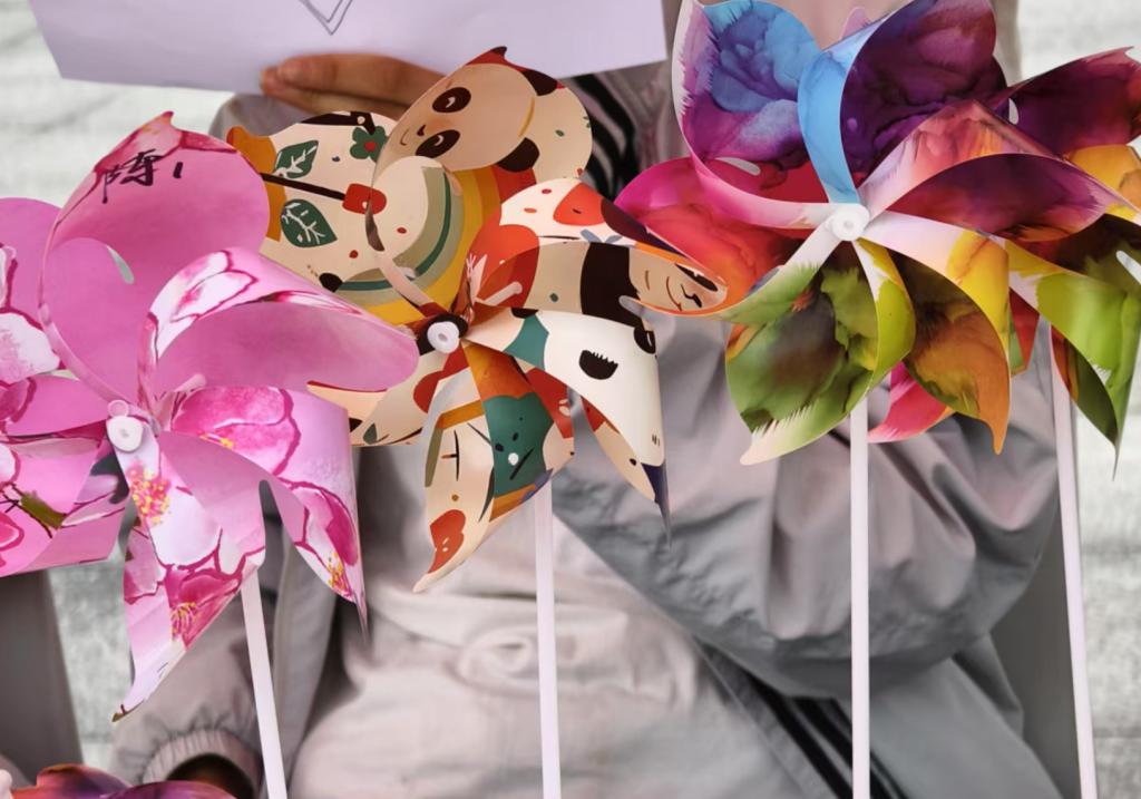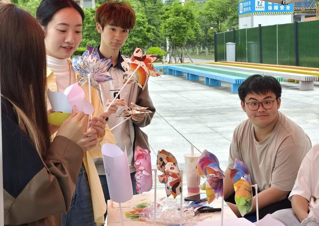 活动全程聚焦创作体验,五张长桌拼接成开放式工作台,浅粉、天蓝、鹅黄等彩色卡纸和马克笔有序摆放,折叠说明书和可拆卸风车支架供同学们自由取用。同学们积极参与,或独自凝神构思,或三五成群交流创意。“春随人好,人与春宜”“无事绊心弦,所得皆所愿”“爱当下,向未来”……同学们满怀真情,在风车上写下对自己和他人的美好祝福,既有对学业孜孜以求的殷切期待,亦有对友谊热忱守护的真挚守望,更饱含着对锦绣前程的坚定憧憬。书写、折叠、组装,承载美好祝愿的风车制作而成。同学们手握做好的风车,互相分享心底最深处的情感与最诚挚的祝福。当微风拂过,风车缓缓转动,这些载满温情的话语随风飘散至校园的每一个角落,传递着无尽的温暖与希望。也有不少同学手持自制的风车拍照留念,转动的叶片与飞扬的衣角相映成趣,成为春日校园独特的风景线。
