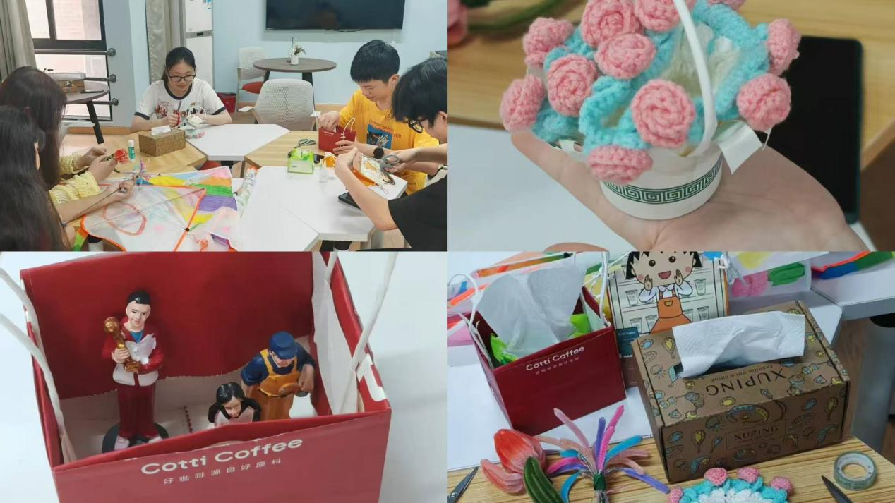 “巧手改造·实践暖人”废品改造活动成为环保与心育结合的亮点。同学们将咖啡袋、快递盒等物品改造成实用工艺品,用实际行动践行绿色环保理念。