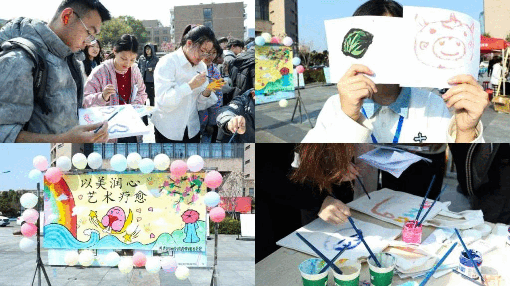 3月20日,“以美润心·艺术疗愈”系列美育活动重磅启幕,为同学们搭建起艺术与心灵对话的桥梁,为心理健康教育月奏响了精彩序曲。“心灵调色盘”帆布包彩绘区里,同学们化身为心灵画家,手执画笔,将内心的情绪与感悟倾注于画布之上。每一笔色彩的涂抹都是一次压力的释放,每一幅独特的作品都是一份心灵的慰藉,同学们在艺术创作中感受着治愈的力量。“心心相印”击掌打卡计划以别出心裁的互动形式吸引着同学们热情参与,大家用画笔在打卡板上镌刻下友谊的印记,共同勾勒出一幅色彩斑斓的集体艺术长卷。一笔一划间,是欢笑与协作的交织,是心灵与心灵的贴近。单日超580人次的参与热度,为活动月注入热烈开端。